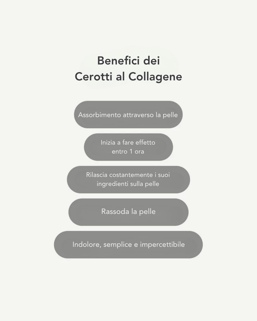 I nostri cerotti al collagene sono progettati per migliorare la salute della pelle, delle articolazioni e dei muscoli grazie a una potente miscela di ingredienti scientificamente provati: